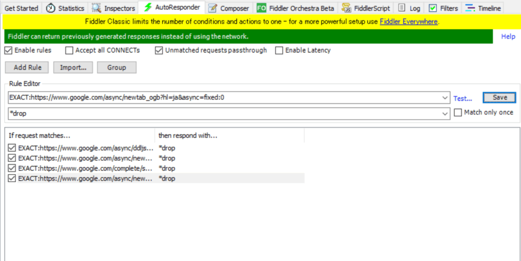 Fiddlerの強力な機能の一つ「AutoResponder」を使えば、特定の通信を意図的に失敗させ、擬似的な障害状況を作り出すことができます。例えば「特定のJSファイルが読み込めなかったら、サイトはどう表示されるか?」といったテストが、サーバーに一切影響を与えず、自分のPCの中だけで簡単に行えます。