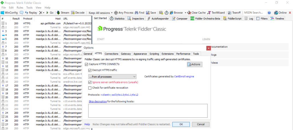 5. 最後に「OK」ボタンをクリックして設定完了です。これで、HTTPS通信の中身もFiddlerで確認できるようになりました。