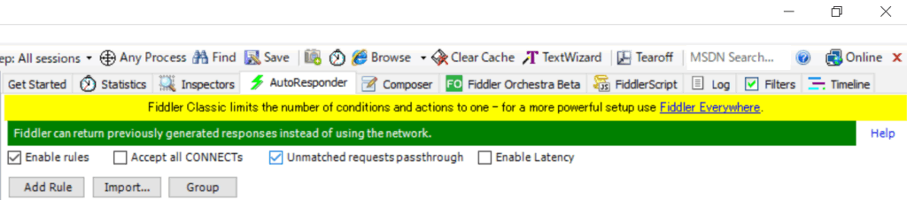 1. Fiddlerの右側にあるパネルから「AutoResponder」タブをクリックします。