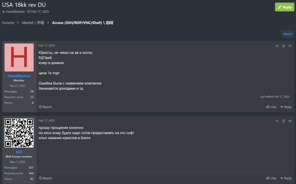 Global GroupではさらにIABから直接、攻撃対象者へのリモートアクセスを購入しています。例えば、前述のGlobal Groupと関係があるとされている脅威アクター「$$$」は2025/02/17にロシア語話者のIAB「HuanEbashes」から、米国を拠点とする法律事務所へのRDPアクセスの購入を試みています。