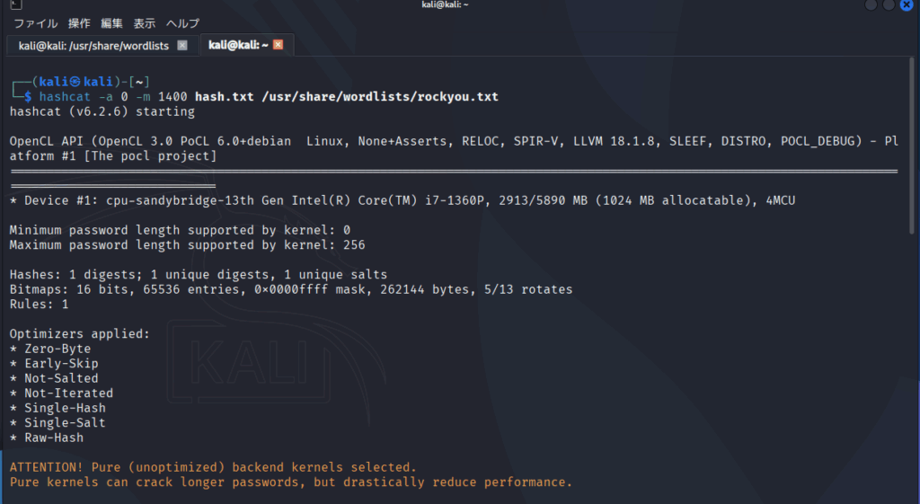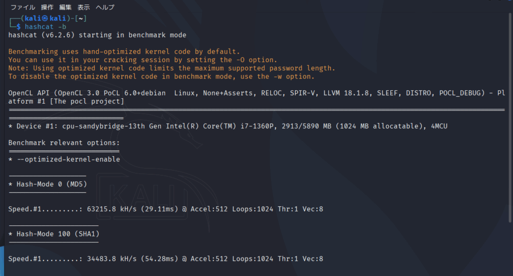 最後に、hashcatが正常に動作するかを確認しましょう。ターミナルで以下のコマンドを実行してください。