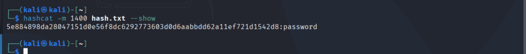 hashcat -a 0 -m 1400 hash.txt /usr/share/wordlists/rockyou.txt