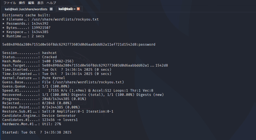 準備が整ったので、実際に簡単なパスワード解析を実行してみましょう。ここでは、SHA256でハッシュ化されたパスワードを、辞書攻撃で解析するシナリオを想定します。