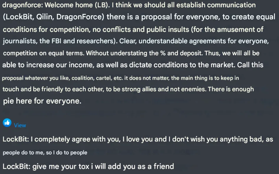 さらに、DragonForceランサムウェアグループの代表者からQilinのような他のグループとの「カルテル」や「連合」の結成を提案され、これに前向きな姿勢を示していたそうです。