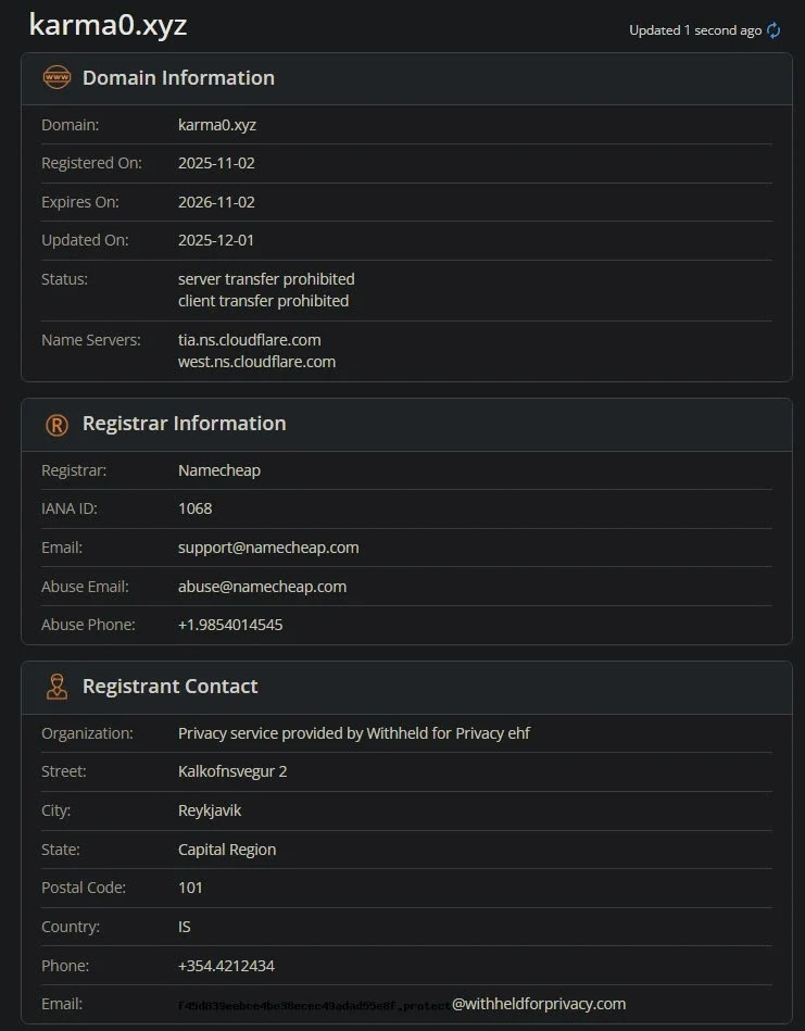 • WHOIS レコードによると、このIPアドレスのあるkarma0.xyz は2025/04/12に登録され、有効期限は 2026/04となっていること