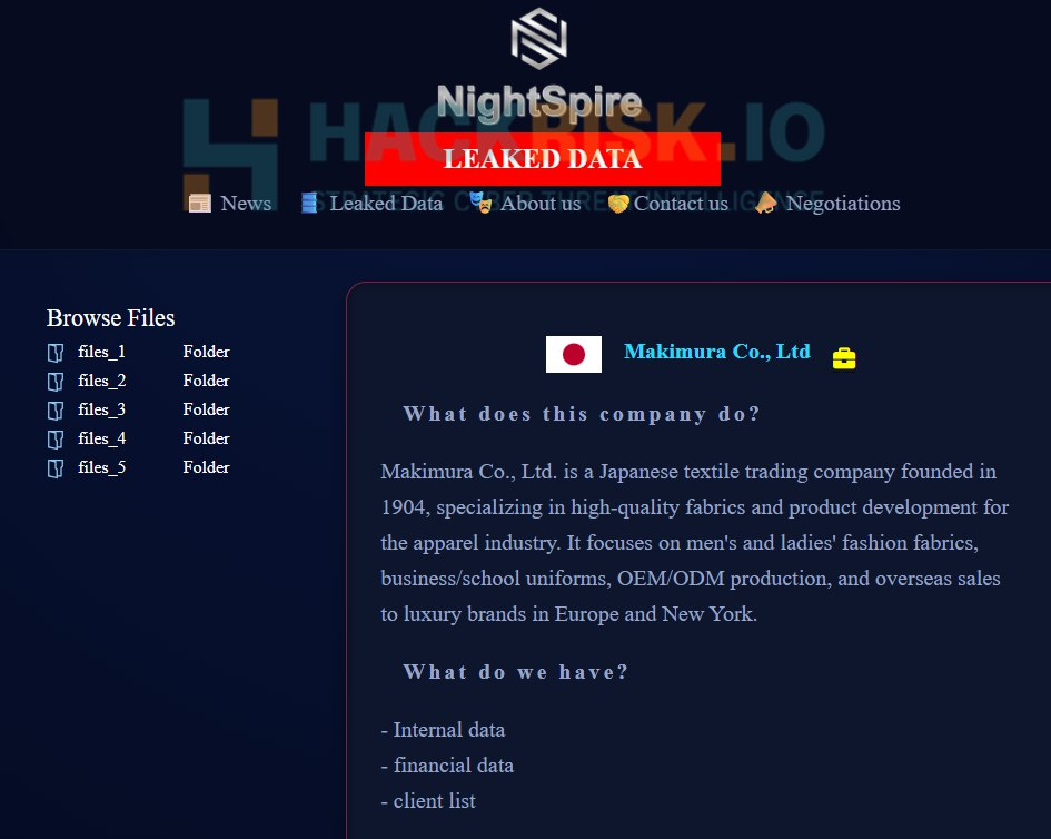 他にも2026/01/31には繊維専門商社の牧村株式会社がNightSpireグループによる攻撃を受けています。