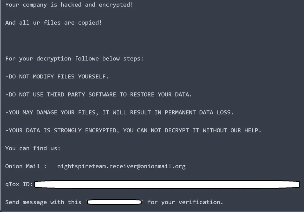 攻撃後には下記のような_nightspire_readme.txtファイルが被害者のフォルダに残されます。
